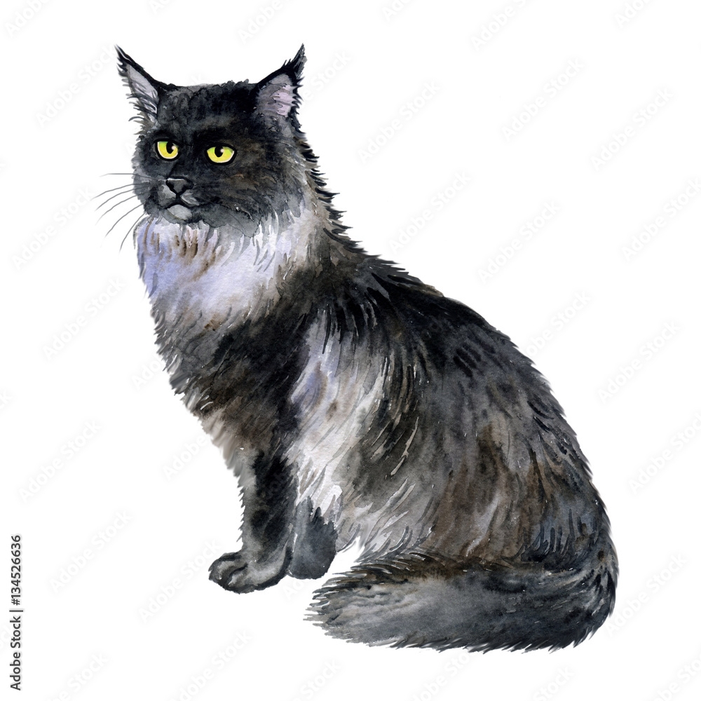 Watercolor Close Up Portrait Of American Longhair Maine Coon Cat Breed Isolated On White Background Gorgeous Black Cat Hand Drawn Home Pet Greeting Birthday Card Design Clip Art Illustration Stock Illustration